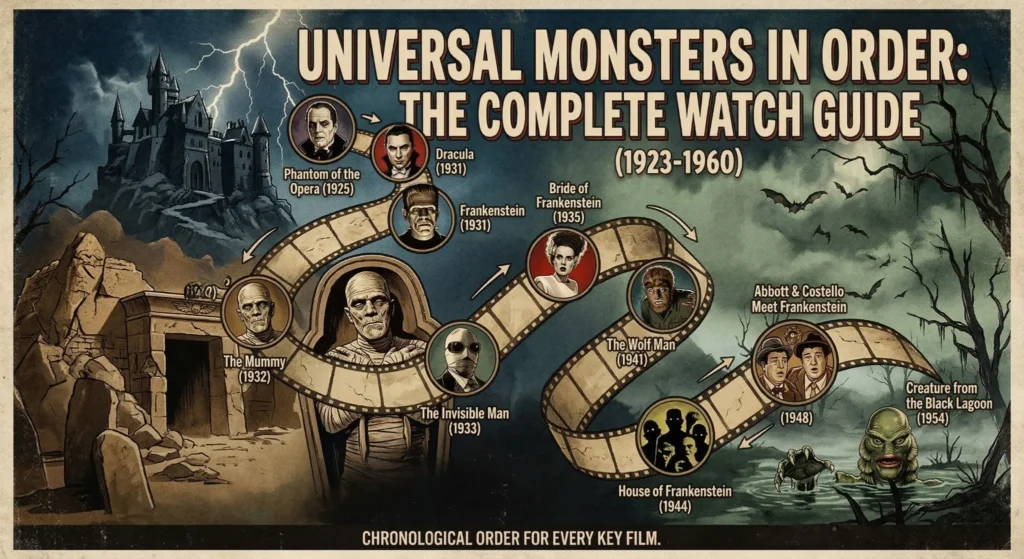 Universal Monsters movies in order can be approached three ways: strict release date, narrative continuity within each monster’s own series, or a curated path that prioritizes quality and context. All three are here. Use whichever one matches where you are.